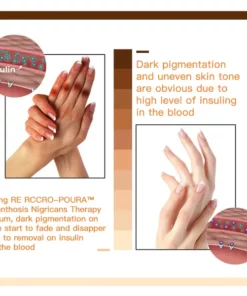 RE RCCRO-POURA™ Acanthosis Nigricans Therapy Serum effectively addresses the primary reason of increased melanin that leads to deepening skin pigmentation by speeding up the clearance of insulin from the blood. The serum stimulates to release glucose that has been held there, which can assist to quickly flush insulin from the circulation.