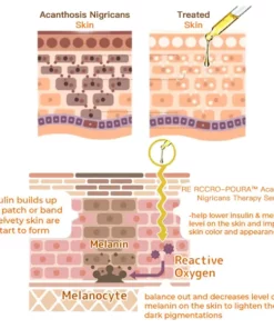 RE RCCRO-POURA™ Acanthosis Nigricans Therapy Serum treats hyperpigmentation associated with Acanthosis nigricans, a skin disorder characterized by regions of dark, velvety discolouration in body folds and wrinkles. The serum includes vitamin A that can help to lightens the skin and lessen the thickness of the afflicted skin, which may help to lower insulin level and lighten the dark areas.