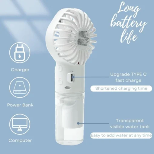 PLEASE NOTE: the spray and fan buttons are long-pressed to start. Upgrade TYPE-C fast charging, the charging time is shortened, and it can also be used while charging.