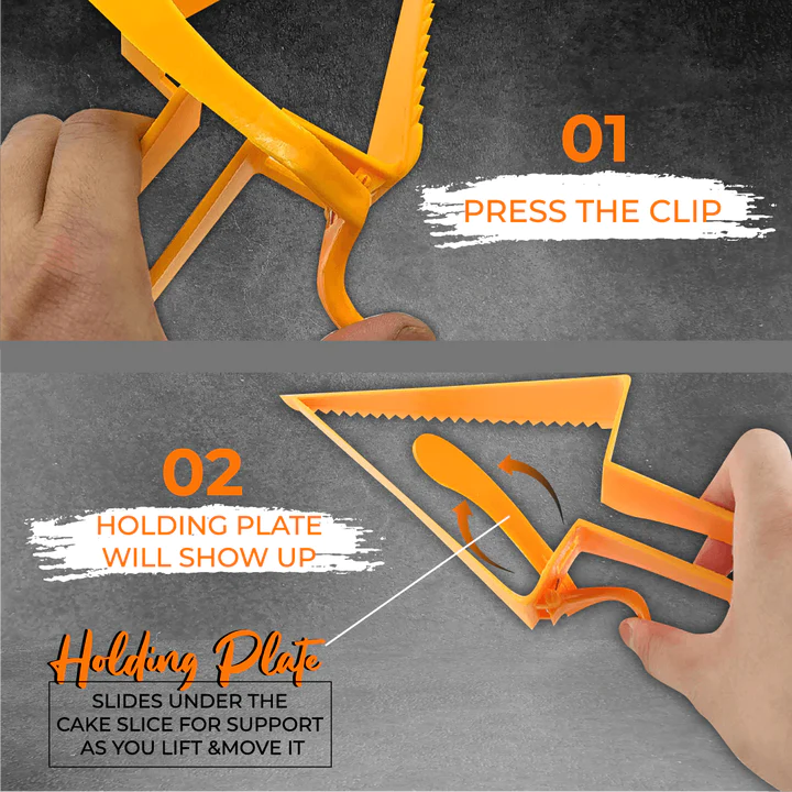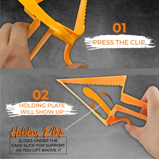 It has a BUILT-IN HOLDING PLATE that GUARANTEES with ONE PRESS, it will SLIDE UNDER your cake for EXTRA SUPPORT as you LIFT and MOVE your cake slice. It can SLICE CAKES PRECISELY and SMOOTHLY PERFECT. Its ONE-HANDED ADVANCE DESIGN making it MORE CONVENIENT than BALANCING the CAKE with KNIFE and FORK.