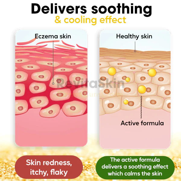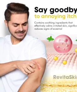 Firstly, this cream enhances the skin’s natural barrier function. The compromised skin barrier in individuals with eczema allows for increased transepidermal water loss and penetration of irritants. RevitaSkin™ Eczema Cure Cream contains specialized lipid molecules that mimic the skin’s natural lipids, reinforcing the barrier and reducing water loss. This promotes improved hydration and prevents the entry of external irritants, allergens, and pathogens that can trigger or exacerbate eczema symptoms.