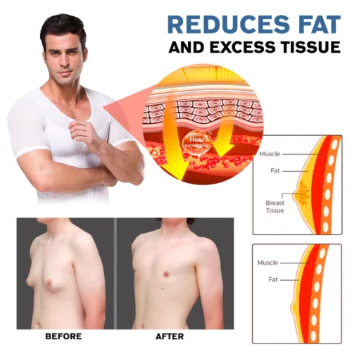 Ricpind Men Gynecomastia Infrared Compression T-Shirt is a compression shirt that helps battle your gynecomastia problem by reducing unwanted fat buildup in the chest area. It works by providing heat treatment to the fatty tissues under your skin, which effectively reduce breast fat and prevent future build-up of fatty breast tissues. Ricpind Men Gynecomastia Infrared Compression T-Shirt adds infrared absorbers, which use specific wavelengths of infrared rays to absorb fat and convert it into heat, thereby increasing cellular metabolic activity, accelerating the process of intracellular fat breakdown, improving local blood circulation, and leading to more supply of oxygen and nutrients to the adipose tissue further accelerates the process of fat metabolism and decomposition.