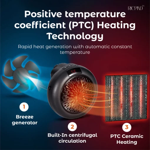 The RICPIND Pro900 Portable Wall Outlet Heater, built around state-of-the-art PTC ceramic heating technology, promises an unparalleled and consistent warmth. This innovative technology enables the heater to dynamically adjust its power consumption through a self-regulating mechanism, optimizing efficiency based on the surrounding temperature conditions. Not only does this intelligent design maintain a consistently high level of warmth, but it also prioritizes safety by actively preventing overheating. This amalgamation of innovative engineering and safety features ensures a reliable and secure heating experience, setting the Plug Heater apart as a leader in warmth and protection.