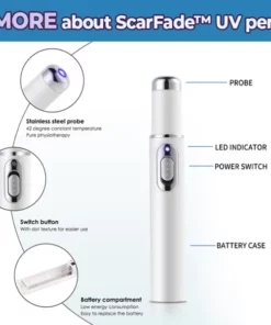 The ScarFade™ UV Phototherapy Scar Removal Pen features a safe and innovative technology that diminishes new and old scars, from stretch marks, burns, and minor cuts and bruises to keloid, hypertrophic, and other surgical scars.