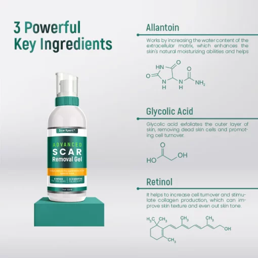 ScarXpert™ Advanced Scar Removal Gel is a non-invasive solution designed to reduce the appearance of scars caused by various skin injuries. Scars, which are composed of collagen, can be unsightly and may cause discomfort. Our advanced formula contains Allantoin and Retinol, which have been clinically proven to reduce the appearance of scars caused by surgery, burns, acne, and other skin injuries. Infused with natural ingredients and nourishing compounds, these formulas help repair damaged skin and enhance its natural healing process.