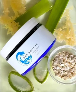 A: Sea Soothe hydrates with sea moss, calms irritation with aloe vera, relieves itching with oats, and protects the skin with vitamin E.
