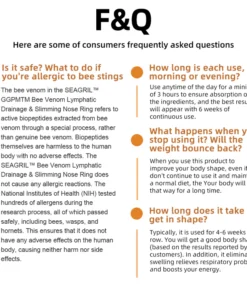 I have combined various botanical ingredients, long known for their benefits to the lymphatic system and body metabolism, to create the SEAGRIL™ Bee Venom Lymphatic Drainage & Slimming Nose Ring. Experimental evidence indicates that this nasal spray is the optimal choice for treating tags. The blend of these ingredients, coupled with the potent properties of bee venom, offers a groundbreaking solution to swiftly address issues of metabolic dysfunction and lymphatic congestion.