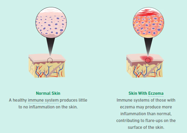 Eczema is usually caused by an imbalance in the patient’s skin flora, an inability to synthesize their own ceramides, a compromised skin barrier, and a significant loss of moisture!