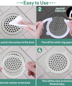 💦Easy to Use: The shower drain hair catcher is very easy to remove and install. First, clean the drain and keep it dry; Second, peel the white ring paper and transparent film on both sides; Finally, stick the hair catcher over the drain and replace it every 2-3 weeks.