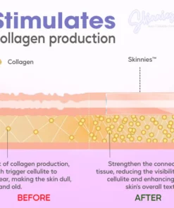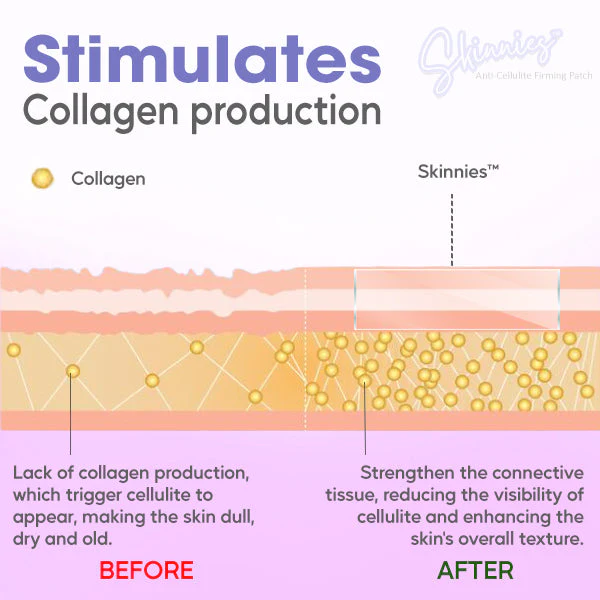 Collagen Boost: Skinnies™ Anti-Cellulite Firming Patch stimulates collagen synthesis, a crucial protein responsible for maintaining the skin’s firmness and elasticity. By promoting collagen production, the patch helps strengthen the connective tissue, reducing the visibility of cellulite and enhancing the skin’s overall texture.