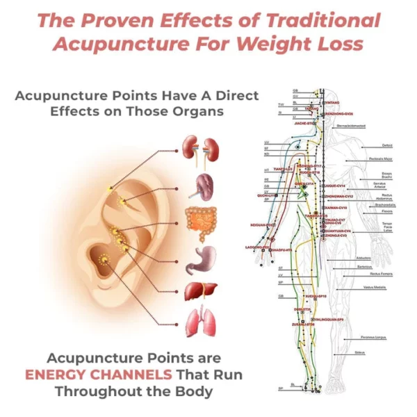 Acupuncture points are believed to stimulate the body’s organs and systems by influencing the flow of qi, or vital energy, throughout the body. Qi flows through meridians, which are energy channels that run throughout the body and are connected to the body’s organs and systems. This stimulation can activate the body’s natural healing processes and help restore balance to the body’s systems. With the stimulation of the specific acupuncture point, it is able to improve digestion, which could lead to improved metabolic function and weight loss.