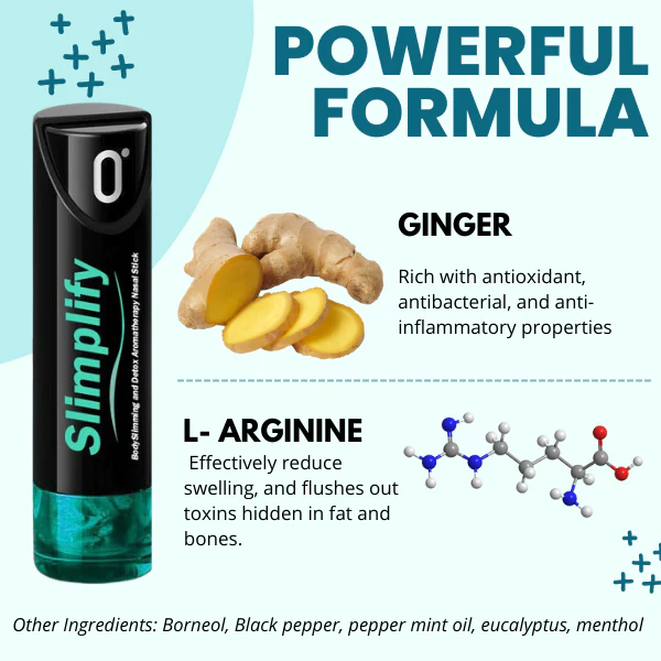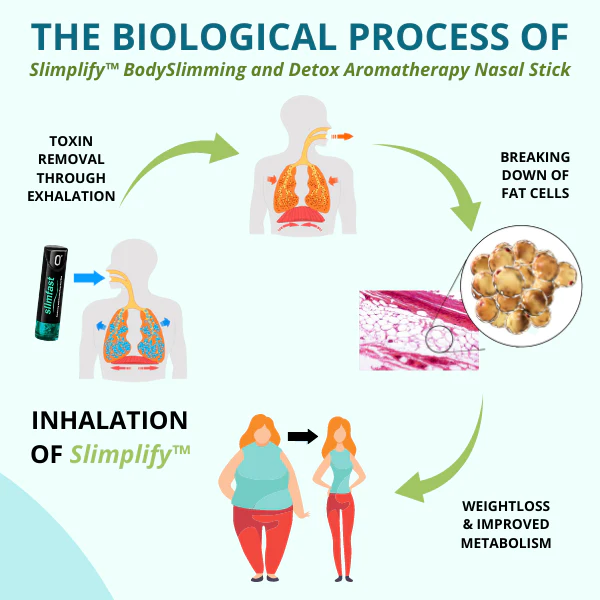 These studies have resulted in the development of the Slimplify™ BodySlimming and Detox Aromatherapy Nasal Stick, which aids in the elimination of toxins, the breakdown of fat cells, and the reduction of weight, and the stimulation of metabolism.