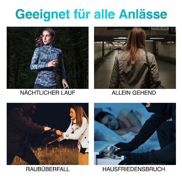 - Erzeugt einen 130-dB-Alarm, um potenzielle Angreifer abzuwehren.