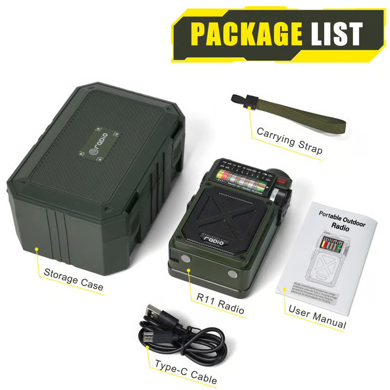 The package includes the R11 solar emergency radio, a Type-C charging cable, a convenient carrying strap, a detailed user manual, and a rugged gift box. Whether you’re gifting a loved one or preparing your own emergency kit, this device is a smart, practical choice.