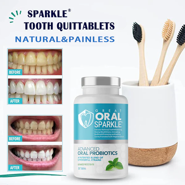 SPARKLE® Tooth QuitTablets can kill 99.99% of bacteria, eliminate bad breath, remove tooth plaque and tartar, heal gingivitis and periodontitis, relieve toothache, prevent and remove cavities, restore tooth enamel, stimulate the formation of restorative dentin, and stimulate the regeneration of lost teeth.