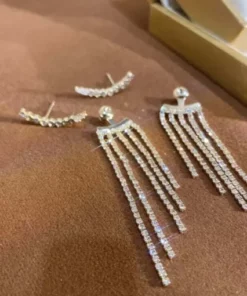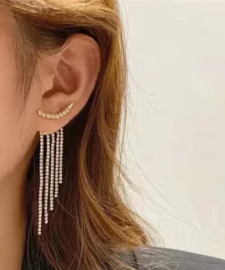 Package Includes: 1 pair * Sparkling Curved Rhinestone Long Tassel Earrings