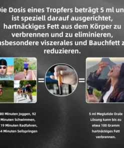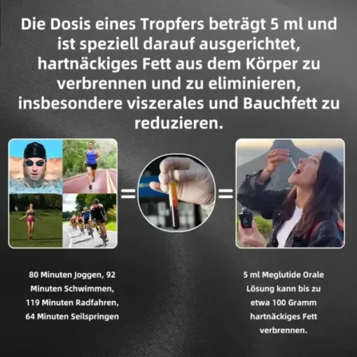 Studien haben gezeigt, dass 5 ml der Meglutide Oral Solution bis zu etwa 100 Gramm hartnäckiges Fett verbrennen können. Und es dauert eine lange Zeit, um 50 Gramm Fett durch Sport zu verbrennen (80 Minuten Joggen, 92 Minuten Schwimmen, 119 Minuten Radfahren, 64 Minuten Seilspringen). Die Dosis eines Tropfers beträgt 5 ml und ist speziell darauf ausgerichtet, hartnäckiges Fett aus dem Körper zu verbrennen und zu eliminieren, wobei sie besonders effektiv bei der Reduktion von viszeralem und abdominalem Fett ist.