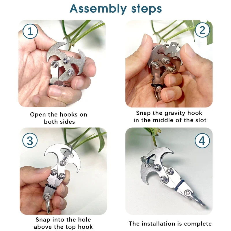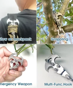 Grappling Hook: Made of solid stainless steel, it is with an ingenious locking mechanism and can double as a gravity hook.