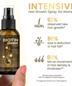 In an older 2021 study. women with self-perceived thinning hair were randomized to receive either a multi-ingredient hair growth spray that contained biotin or a placebo for 2 months.Those who received the Stovis™ Biotin Hair Booster reported a visible increase 79% in overall hair volume. scalp coverage. and thickness after the treatment period. The researchers concluded that the biotin was effective because hair loss is associated with a biotin deficiency. correcting a deficiency with this spray can prevent hair loss.