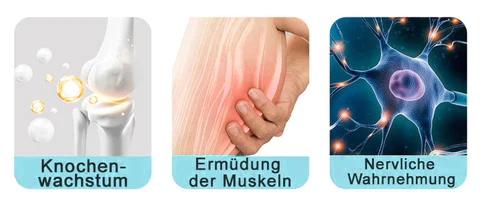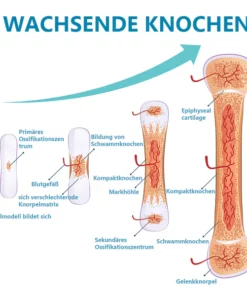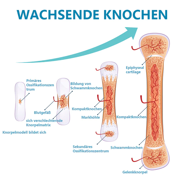 Der Haupttransportweg für die Titanelemente führt über die drei großen Wachstumsakupunkte. Sie gelangen in den Blutkreislauf und zirkulieren im ganzen Körper, wo sie sich an den Wachstumsplatten und kalziumreichen Bereichen in den Knien, Ellbogen und der Wirbelsäule anreichern. Diese Wechselwirkung bewirkt, dass die Knochentrabekel poröser werden und neue Knochenzellen gebildet werden, um die Lücken zu füllen. Dadurch wird das Wachstum und die Verlängerung von Beinen, Armen und Wirbelsäule stimuliert, was zu einem Gesamtwachstum des Körpers mit hervorragenden Körperproportionen führt!