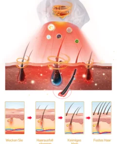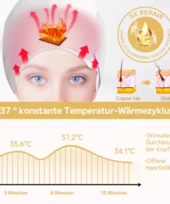 Die thermische Haarwachstumshaubenmaske ist eine sichere, nicht-invasive Behandlungsmethode. Diese Haubenmaske benötigt keine externen Heizgeräte und erwärmt sich konstant nach dem menschlichen Körpergefühl. Sie verwendet die Wärmebehandlung, um die Kopfdurchblutung effektiv zu fördern, Zellen in den Haarfollikeln zu aktivieren und zu erneuern, die Haardichte und Fülle zu erhöhen und das Wachstum neuer Haare zu fördern.