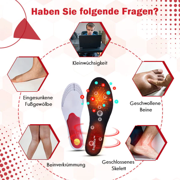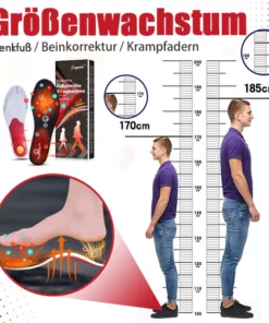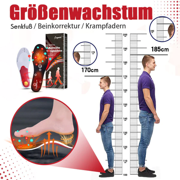 Sugoola™ Höhenverstärkung Einlegesohlen fördern das Knochenwachstum, verbessern die Körpergröße und optimieren die Fußmechanik. Durch Far Infrarot-Therapie und bessere Blutzirkulation wird die Versorgung der Knochen mit Nährstoffen und Sauerstoff unterstützt. Die Einlegesohlen lösen Fußprobleme, korrigieren Fußfehlstellungen und tragen zur Gesundheit des gesamten Skeletts bei. Die gezielten Druckpunkte an der Fußsohle verbessern die Durchblutung, lindern venöse Probleme und fördern die Entgiftung. Eine ganzheitliche Lösung für optimiertes Körperwachstum und verbesserte Bewegungsgesundheit.