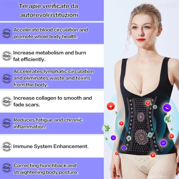 The LUCKYSONG™ ion sculpting vest utilizes innovative technology with embedded graphene fibers. These fibers promote cell regeneration and improve nerve function, aiding in enhancing back health and posture. Additionally, the vest incorporates millions of magnetic nanoparticles that generate a static magnetic field, further enhancing blood circulation and muscle relaxation. The use of wormwood also enhances the effectiveness of this static magnetic field. By combining these two technologies, the LUCKYSONG™ vest provides comprehensive back health and posture improvement effects.