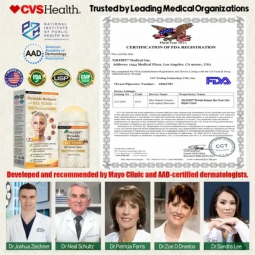 “As a dermatologist, I’ve always been passionate about finding effective, natural solutions for skin problems. After extensive research and testing with my lab team, and clinical trials involving over 2,000 participants, I discovered that bee Toxin is a powerful natural ingredient for addressing a wide range of skin concerns. This led me to create the TAILEDEN™ Wrinkle Relaxer 𝐁𝐞𝐞 Toxin 𝐒𝐤𝐢𝐧 𝐑𝐞𝐩𝐚𝐢𝐫 𝐂𝐫𝐞𝐚𝐦—an all-in-one solution designed to naturally and effectively relieve multiple skin issues with precision.” – Dr. Doris Day MD, Dermatologist