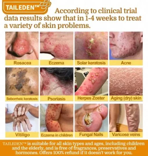 TAILEDEN™ is designed to address a variety of skin concerns, including skin tags, moles, seborrheic keratosis, rosacea, deep wrinkles, age spots, melasma, uneven skin tone, psoriasis, vitiligo, scars, shingles, eczema, dermatitis, itchiness, dryness, and other skin problems.