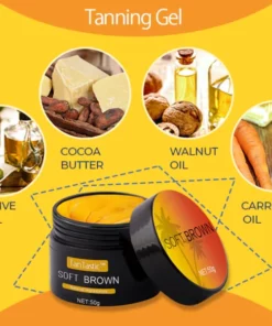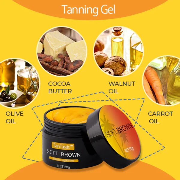 - TanTastic™ Intensive Tanning Luxe Gel : Carrot oil, Olive oil, Cocoa butter, Walnut oil