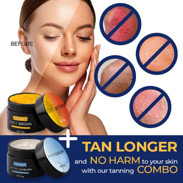 Unlock a longer-lasting tan with our 2-in-1 package! Our after-sun cream not only enhances and locks in your tan, but also nourishes your skin to keep it hydrated and supple. Experience an amazing bronze shade with our specially formulated cream that provides the perfect protection your skin needs. Don’t settle for fading tans – try our product now and enjoy a longer-lasting tan!