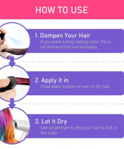 Applying this temporary hair color is quick and easy. Simply spray your hair with water, choose your favorite color, and apply the chalk to your damp hair. Stroke it from top to bottom, and finish by gently drying with a hairdryer. The best part? It washes out easily with water and shampoo, leaving no residue behind.