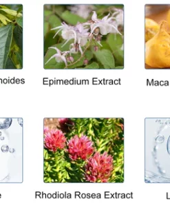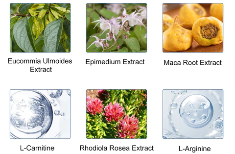 Ginseng: Known for its anti-fatigue and anti-stress properties, it regulates testosterone levels, enhances libido, and increases sexual desire.