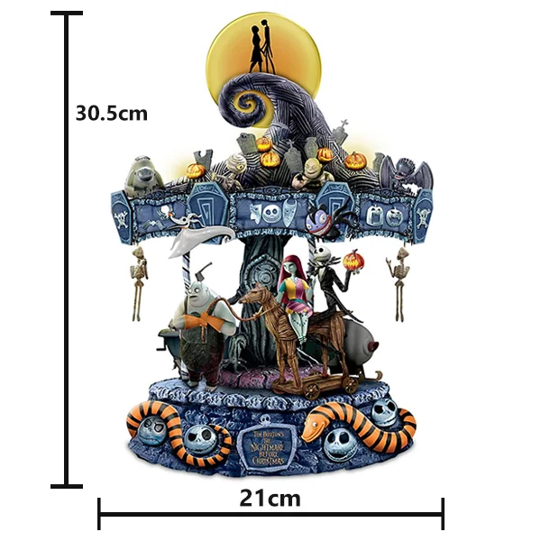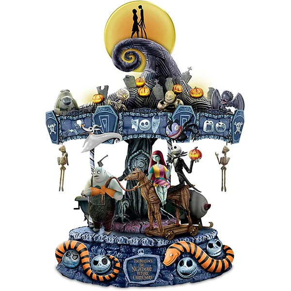 Inspired by a poem Tim Burton had written in 1982 while working at the Walt Disney Animation Studios, Tim Burton’s “The Nightmare Before Christmas” went on in 1993 to become a film classic that captures the hearts and imaginations of millions. Now, the blockbuster film inspires The Nightmare Before Christmas Carousel, an inventive first-ever from The Bradford Exchange that whirls you back to Halloween Town with the turn of a key and a spectacular display of lights, music and motion. Jack Skellington, Sally, Zero, Oogie Boogie, Dr. Finkelstein, the Mayor, Lock, Shock and Barrel – all your favorite characters are here, over twenty in all, hand-sculpted, handcrafted in artist’s resin, and hand-painted in frighteningly fine detail.