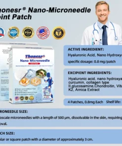 The Thonesr® Nano-microneedle joint patch is a breakthrough solution for joint pain and support. This innovative patch combines the powerful healing properties of Hyaluronic Acid (HA) with advanced precision microneedle technology to deliver deep, precise treatment where it matters most.