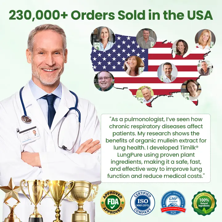 “As a pulmonologist, I’ve seen the struggles of chronic respiratory diseases. My recent research highlighted the powerful effects of organic mullein extract on lung function. Combining proven plant-based ingredients, I developed Timilk® LungPure, an effective solution for chronic respiratory issues. I highly recommend it as a fast, safe, and non-invasive way to improve lung health and save on medical costs.”—Dr. Michael Roth