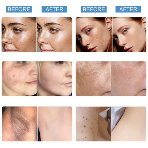 Contains powerful and effective ingredients that work deeply in the skin to reduce dark spots, pregnancy spots, sun spots, hyperpigmentation, scars, discoloration, melasma, and uneven tones on the face and body to give you an even new skin tone. Perfect for spots, moles, skin tags, etc. on both face and body.