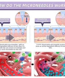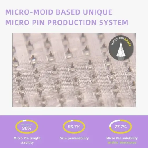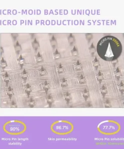 Each needle is 0.27mm long, just 1/7th the thickness of a hair, and is made from dissolvable medication. These micro-needles are precision-engineered using cutting-edge manufacturing techniques to ensure a seamless, pain-free experience while effectively delivering the active ingredients directly into the skin.