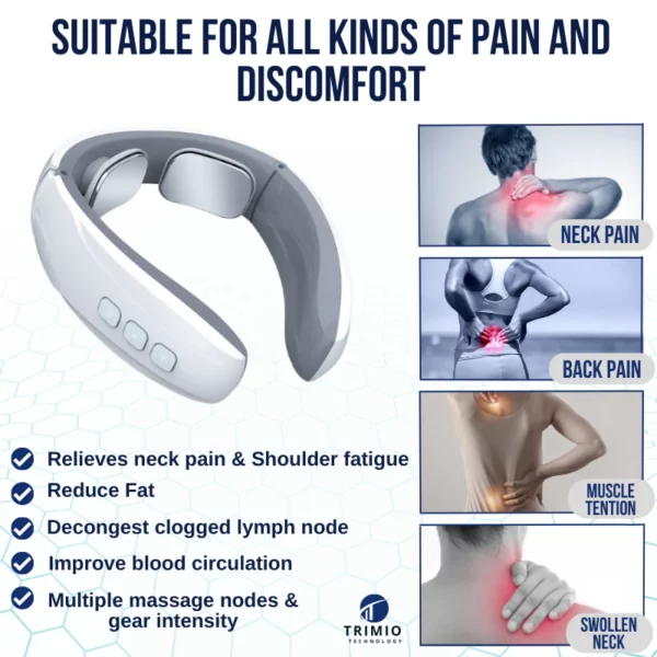 With the TRIMIO Lymphatic Drainage Neck Device, you can enjoy the ultimate neck massage therapy. Powered by (TENS) pulsed current technology, this electronic massager stimulates and strengthens your blood circulation while relieving tension in your neck and shoulders and promoting excellent blood circulation to prevent lymphatic drainage clogging.
