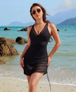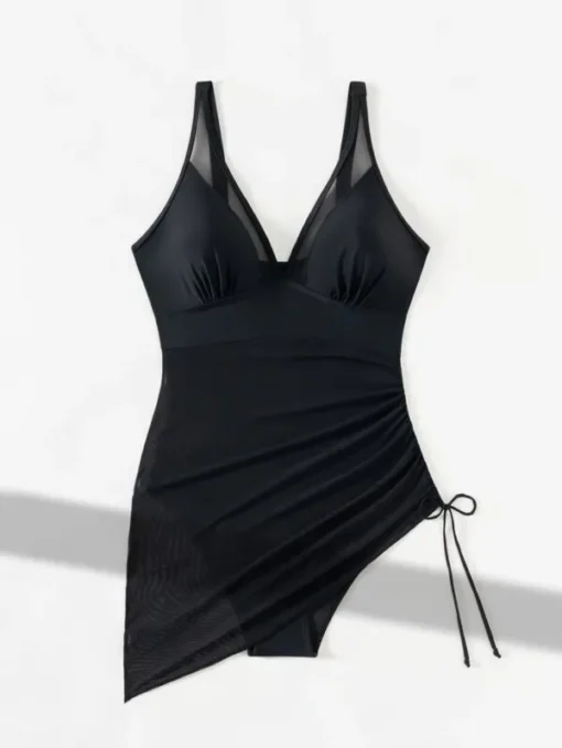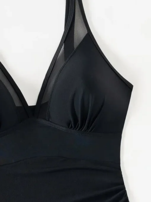 The Tummy Control Mesh Swimsuit is a flattering, comfortable swimsuit with tummy control, a stylish mesh v-neck, and adjustable straps for a perfect fit.