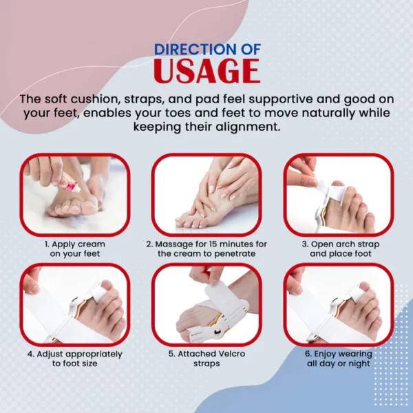 - Enjoy the Benefits: As you continue using the Ultracare™ Bunion Cream & Corrector Set, you’ll experience the benefits of realigned toes, reduced discomfort, and improved foot function. Regular use is key to achieving the best results.