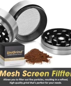 Mesh Screen Filters: Designed with a built-in mesh screen, this grinder allows you to filter out fine particles, resulting in a refined, high-quality grind that’s perfect for your needs.