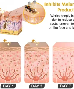 Bee Venom: works by inhibiting the production of melanin, the pigment responsible for skin coloration. By reducing melanin synthesis, kojic acid helps to fade dark spots, hyperpigmentation, and uneven skin tone, leading to a brighter and more even complexion.