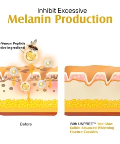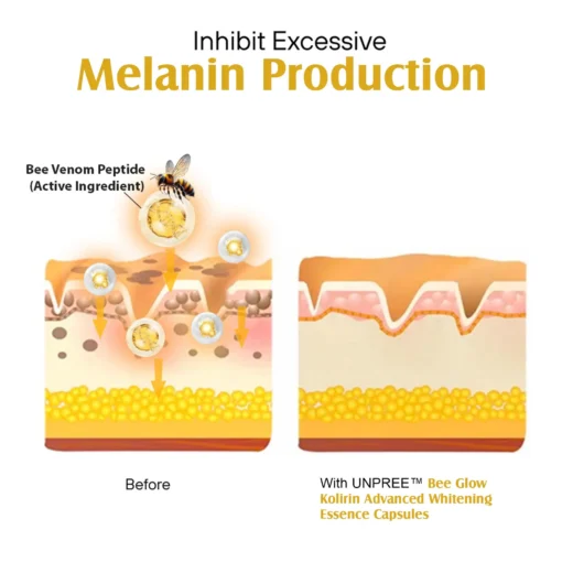 The UNPREE™ Bee Glow Kolirin Advanced Whitening Essence Capsule features a powerful formula enriched with bee venom, which contains minerals and vitamins, including zinc, magnesium, potassium, and Vitamin C, which are essential for brightening skin. These agents work diligently to inhibit excessive melanin production, the primary cause behind uneven skin tone. With every application, Unpree™ actively combats hyperpigmentation, gradually revealing a brighter, more even complexion.