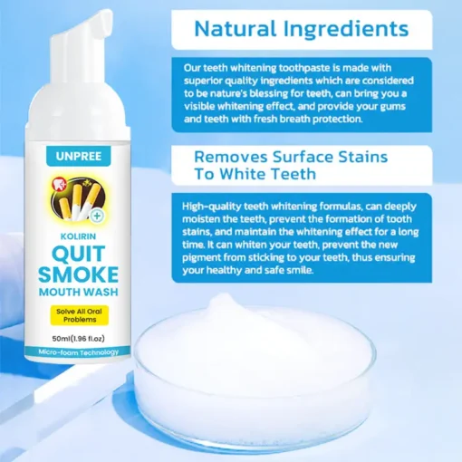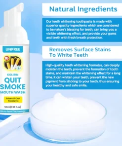 UNPREE™ Kolirin QuitSmoke Mouthwash can assist in eliminating dental plaque, calculus, and germs, among other concerns. Regardless of whether your teeth are yellow or black, it can achieve complete whitening within just 1 week.
