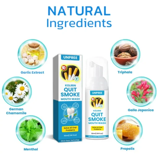 UNPREE™ Kolirin QuitSmoke Mouthwash cravings with menthol’s cooling effect, soothes gums with chamomile, and eliminates bacteria with garlic extract. Galla Japonica helps restore taste sensitivity, making cigarettes less appealing, while Triphala detoxifies oral tissues from tobacco residue. By refreshing breath and healing oral damage, it helps break the smoking habit naturally.