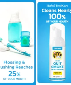 UNPREE™ Kolirin QuitSmoke Mouthwash is the latest product certified by the American Dental Association and recommended by dentists. It can perfectly solve all oral problems, including dental calculus, bad breath, oral ulcers, dental caries, bleeding gums, tooth sensitivity, gingivitis, loose teeth, periodontitis, swollen gums, tooth damage, tooth loss, etc. No side effects. Made from 100% natural herbs. Suitable for everyone, including children, young people, and the elderly.