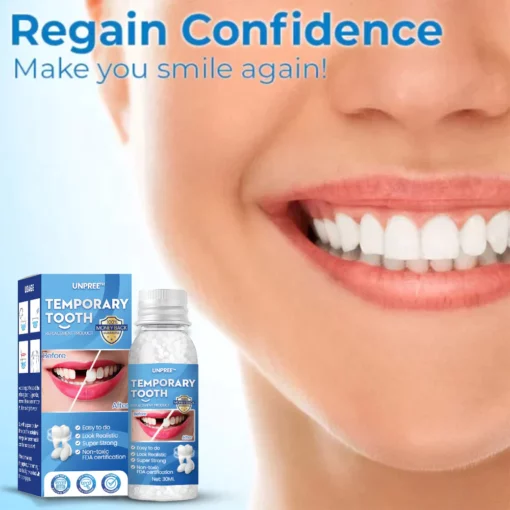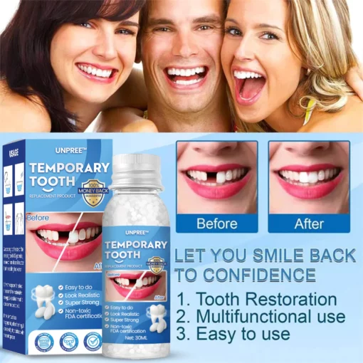 Unpree™ Temporary Moldable False Tooth was developed as a quick, easy, and affordable temporary tooth replacement solution after being frustrated with expensive and time-consuming alternatives.The results of these teeth beads are completely natural, so no one will ever suspect a thing. Our kit is a great do-it-yourself option until you see your dentist or get a dental implant.