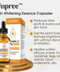 Don’t worry! Our UNPREE Vitamin C Skin Whitening Serum are your key to unlocking radiant skin from within. Formulated with potent ingredients and advanced technology, these capsules target dark spots, hyperpigmentation, and uneven skin tone, revealing a luminous complexion.