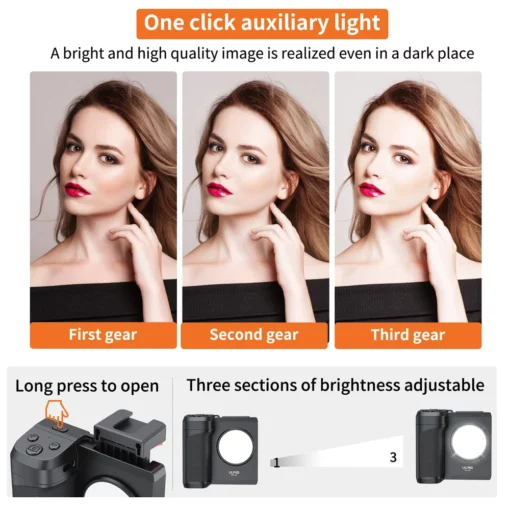 【Built-in Fill 】The handle grip has a fill in the front side, which provides you with soft white to make you look more beautiful before the mobile phone lens. Supports 3 levels adjustable brightness and built in rechargeable lithium battery.